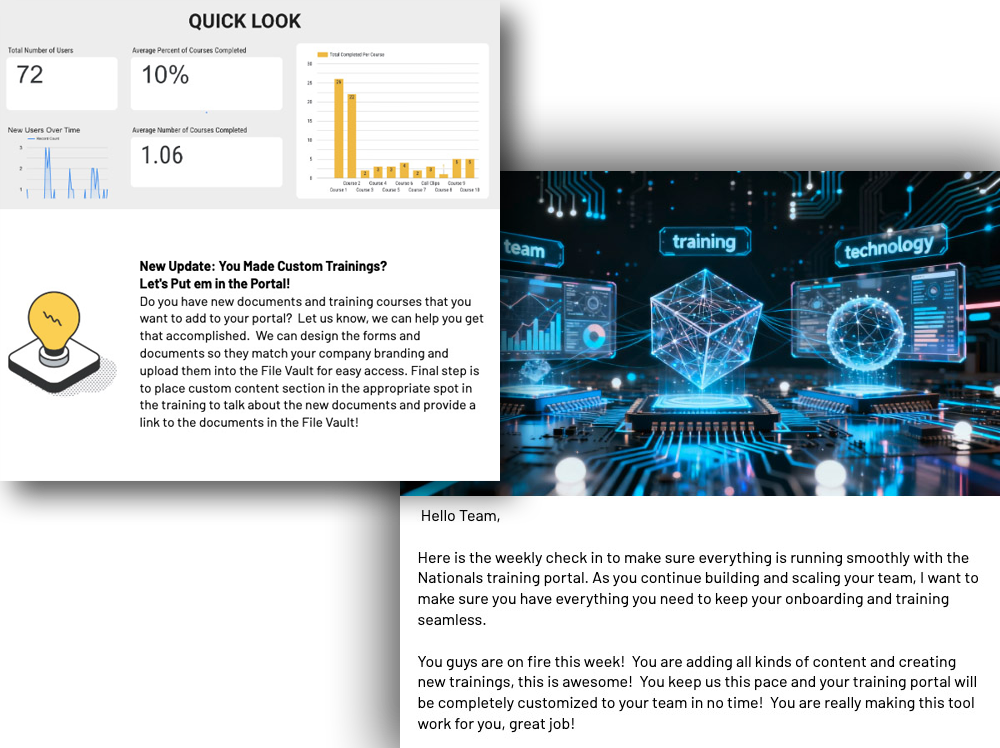 Receive weekly emails with progress reports, updates on available technology and tips to improve the training experience for your team